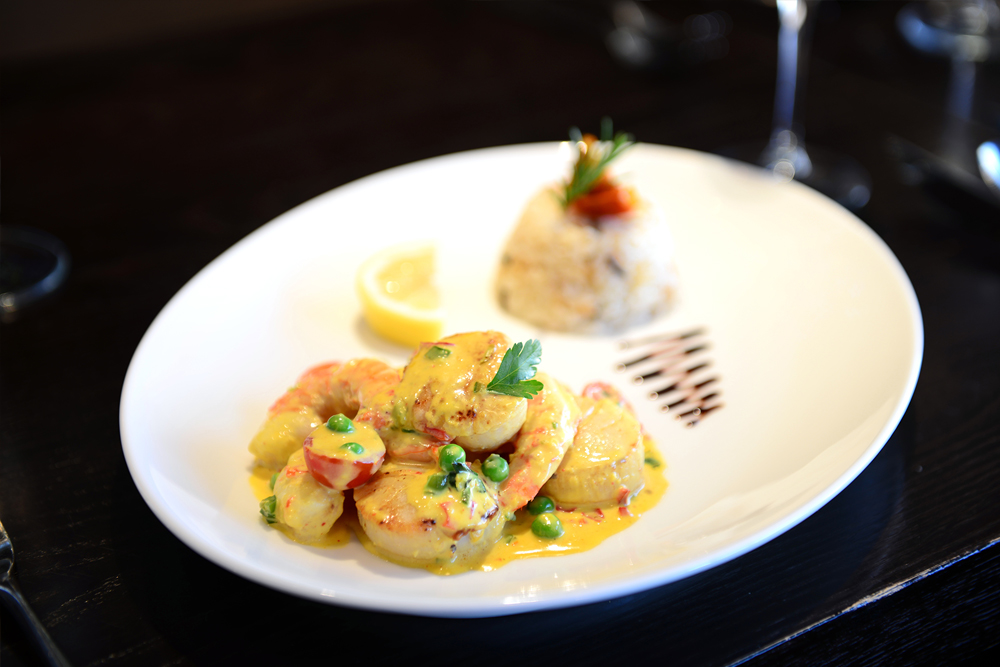 Pan fried king scallops and Tiger prawns in chefs special cream, white wine and saffron sauce with fresh basil, cherry tomatoes, chilli and green peas, served with steamed rice.